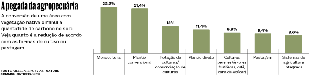 A monocultura é a modalidade agrícola que mais reduz o carbono no solo, seguida das formas tradicionais de preparo da terra para plantio, ambas com uma diminuição acima de 20%, de acordo com o artigo. Ao revolver o solo com arado e outros instrumentos para moldar a área de cultivo, o trabalho convencional de preparo da terra acaba favorecendo a liberação de parte do carbono retido abaixo da superfície. Não por acaso o plantio direto, que dispensa a aragem, libera para a atmosfera apenas metade do carbono no solo, que é emitido pela adoção da maneira usual de preparar a terra.