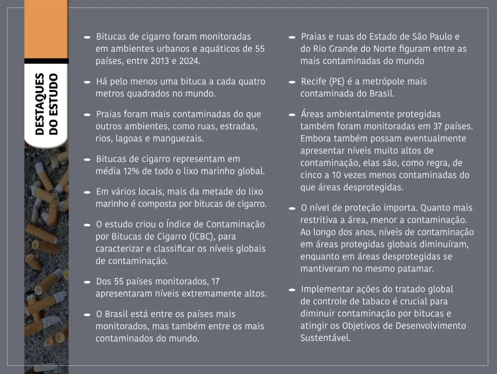O artigo Global cigarette butt contamination: a review pode ser acessado em: link.springer.com/article/10.1007/s10311-026-01897-0.
