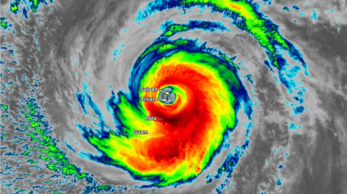 Imagem infravermelha do Super Tufão Sinlaku em 14 de abril de 2026, quando era uma tempestade de categoria 4 sobre as ilhas Tinian e Saipan nas Marianas do Norte | Imagem: NOAA/RAMMB/Colorado State University/Reprodução Yale Climate Connections