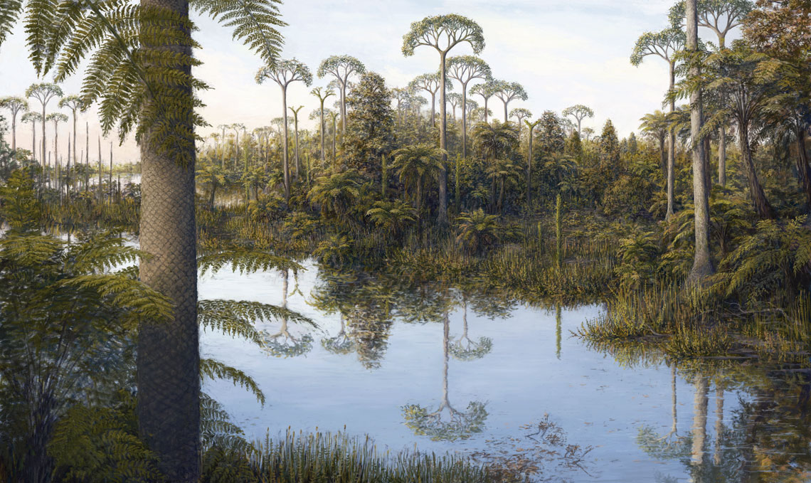 Representação artística da floresta de Cerro Chato; a árvore à esquerda, uma licófita, chegava a 30 m de altura | Imagem: Zeinner de Paula / FERRAZ, J. S. et al. Journal of South American Earth Sciences. 2025